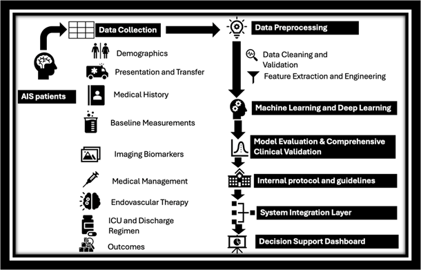 NeuroSmart is a machine learning (ML)-based system that processes large-scale patient data, ranging from 10,000 to 100,000 cases, to generate evidence-based insights for acute ischemic stroke care. The system's algorithm is built in several stages, starting with data acquisition and preprocessing, which involves collecting and cleaning patient records and medical images while ensuring compliance with regulations like HIPAA and GDPR. The next stage is machine learning model development, which evaluates various ML models, including Random Forest, Gradient Boosting, Logistic Regression, and Deep Learning (CNNs & RNNs), for different stroke-related predictions. This is followed by backend development and deployment, which uses a technology stack that includes frameworks like Flask or FastAPI for serving ML models and databases like PostgreSQL or MongoDB for secure storage. Lastly, a user-friendly, web-based dashboard, built with React or Vue.js, allows clinicians to input patient data and receive AI-generated recommendations with confidence scores and visual analytics. This system is distinguished by its ability to provide actionable, personalized recommendations rather than just predictions. Unlike models that rely on medical literature, NeuroSmart is trained on real-world patient data, which ensures its recommendations are directly relevant to clinical decision-making. Its continuously improving, scalable ML framework refines algorithms based on ongoing validation and clinician feedback. The technology is specifically tailored for acute ischemic stroke, ensuring a high level of accuracy and relevance, and it integrates directly into clinical workflows to provide immediate, data-driven guidance.Applications