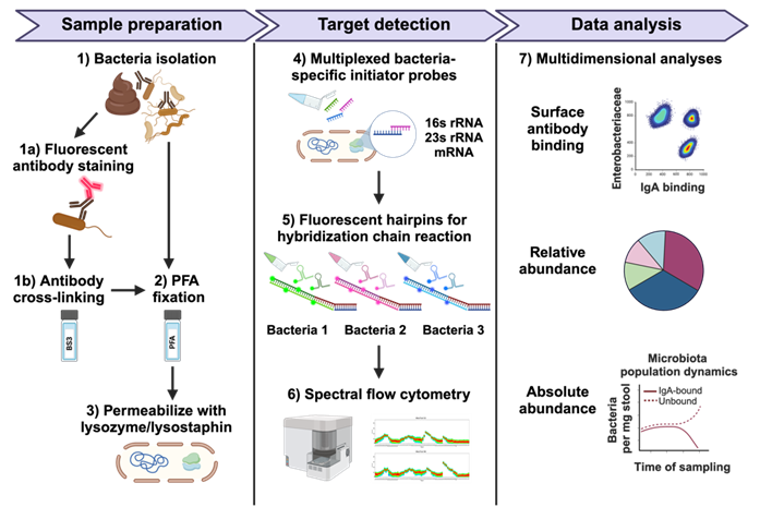 - Rapid, Single-Cell Analysis: Provides faster, more accurate identification and quantification of bacteria at the single-cell level compared to conventional sequencing methods, addressing the critical need for speed in clinical use.- Dual-Characteristic Measurement: Simultaneously determines a bacterium's identity (via HCR) and a crucial surface characteristic (e.g., binding of host antibodies like IgA) in a single assay run.
