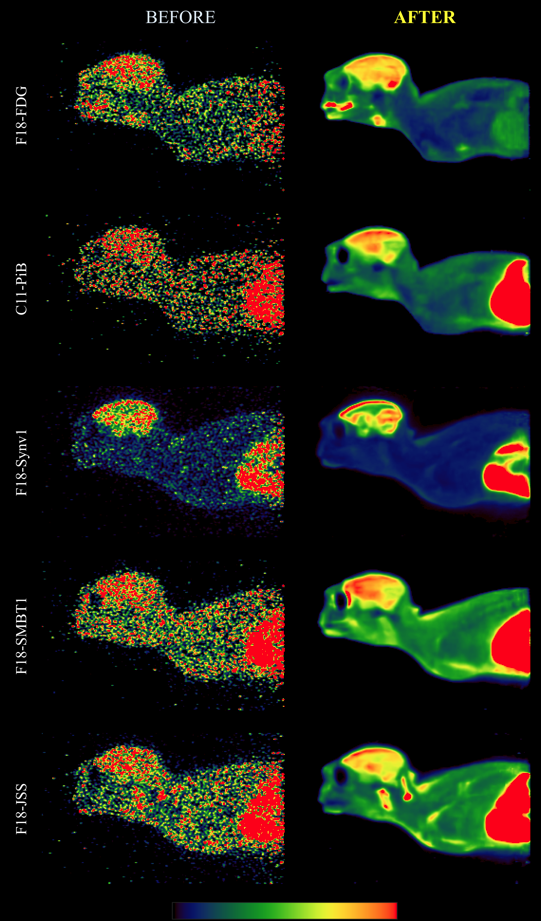 The technology utilizes a sophisticated algorithm to address the poor image quality typically associated with PET imaging. By reconstructing PET data, the software characterizes and eliminates noise more effectively than existing methods. This denoising process results in images with higher anatomical specificity and clarity. Unlike traditional visualization methods that rely on smoothing or spline interpolation, which can introduce diagnostic uncertainty; this method provides a clearer view of raw data, allowing for the reliable identification of positive diagnostic signals that might otherwise be obscured by noise.Applications
